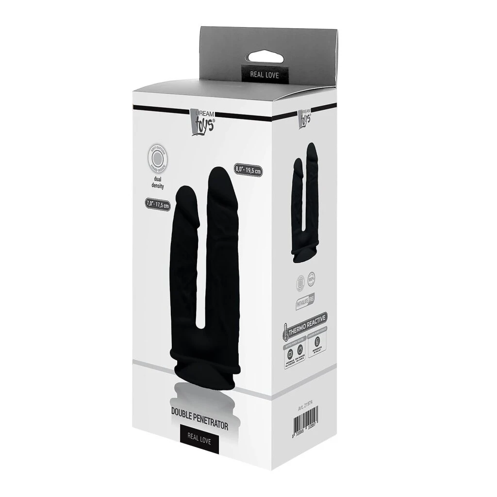 Wenn Sie auf der Suche nach einem Spielzeug mit doppelter Penetration sind, ist dieser Real Love Doppeldildo eine gute Wahl! Der realistische Silikon-Doppeldildo der Marke Real Love hat ein weiches, naturgetreues Äußeres und eine doppelte Dichte. Der feste innere Kern ist mit SILEXPAN® gefüllt und sorgt für ein extrem realistisches Gefühl und ein unvergleichliches Lustempfinden. Die patentierte Formel von SILEXPAN® sorgt für eine bessere Dichte und höhere Flexibilität. Außerdem macht es den Dildo thermoreaktiv, so dass er bei Erwärmung weicher und bei Abkühlung härter wird. Der Saugnapfboden haftet fest auf jeder glatten Oberfläche. Das Material kann bei der Entsorgung recycelt werden. Gesamtlängen: 19,5 cm und 17,5 cm / Einführbare Längen: 14,5 cm und 12,0 cm / Durchmesser: 4,0 cm und 3,3 cm