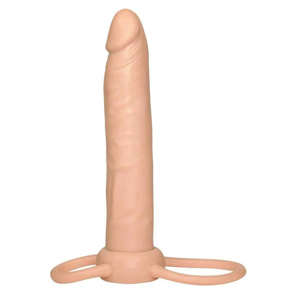 Biegsamer Dildo (16 cm lang, Ø 2,5 cm) mit Schlaufe für den Penis (Ø 3 cm) und Hodenring (Ø ca. 5 cm, dehnbar). Material: TPR.