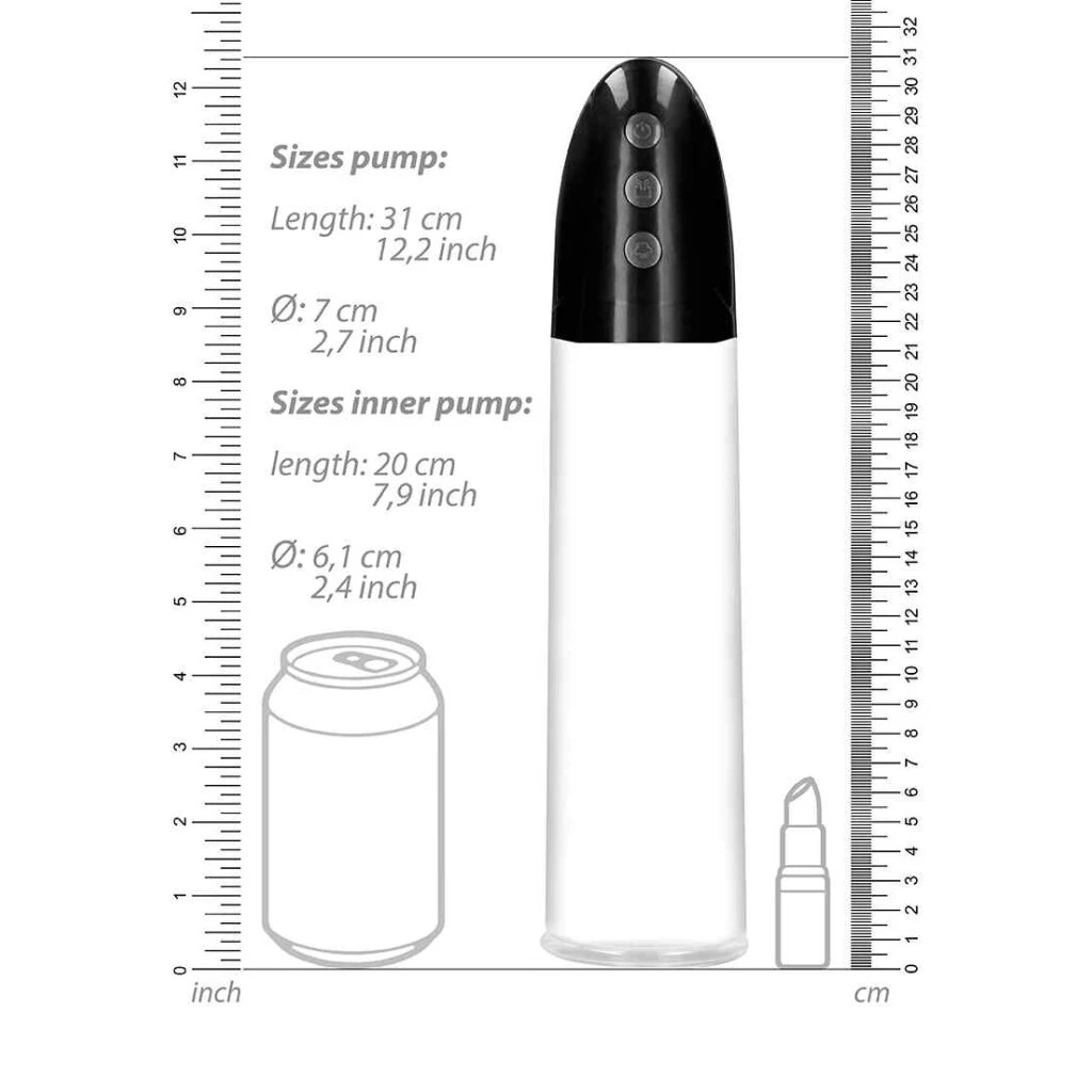 Mit einer Auswahl von 3 verschiedenen Sauggeschwindigkeiten bringt diese Pumpe immer Leistung! Auf Knopfdruck erzeugt diese RECHARGEABLE AUTOMATIC CYBER PUMP ein superstarkes Vakuum, das eine schnelle und kraftvolle Erektion ermöglicht. Die superweiche Masturbationshülse vergrößert die Sicht auf Ihren Penis für eine einzigartige visuelle Stimulation. Die Pumpe dichtet für eine komfortable, aber sehr effektive Saugwirkung immer gut ab. Diese High-Tech-Pumpe ist wirklich leicht zu zerlegen und zu reinigen. Mit einer Höhe von 31 cm (12,2 Zoll)und einer einführbaren Länge von 20 cm (7,9 Zoll) erreicht sie beeindruckende 3700 U/ min bei einem sehr niedrigen Geräuschpegel von weniger als 55dB. Der Innenumfang beträgt 6,1 cm (2,4 Zoll). Der eingebaute wiederaufladbare Akku benötigt 120 Minuten bis zur vollen Ladung, wodurch 120 Minuten Spielzeit erreicht werden! Diese Pumpe ist NICHT wasserdicht