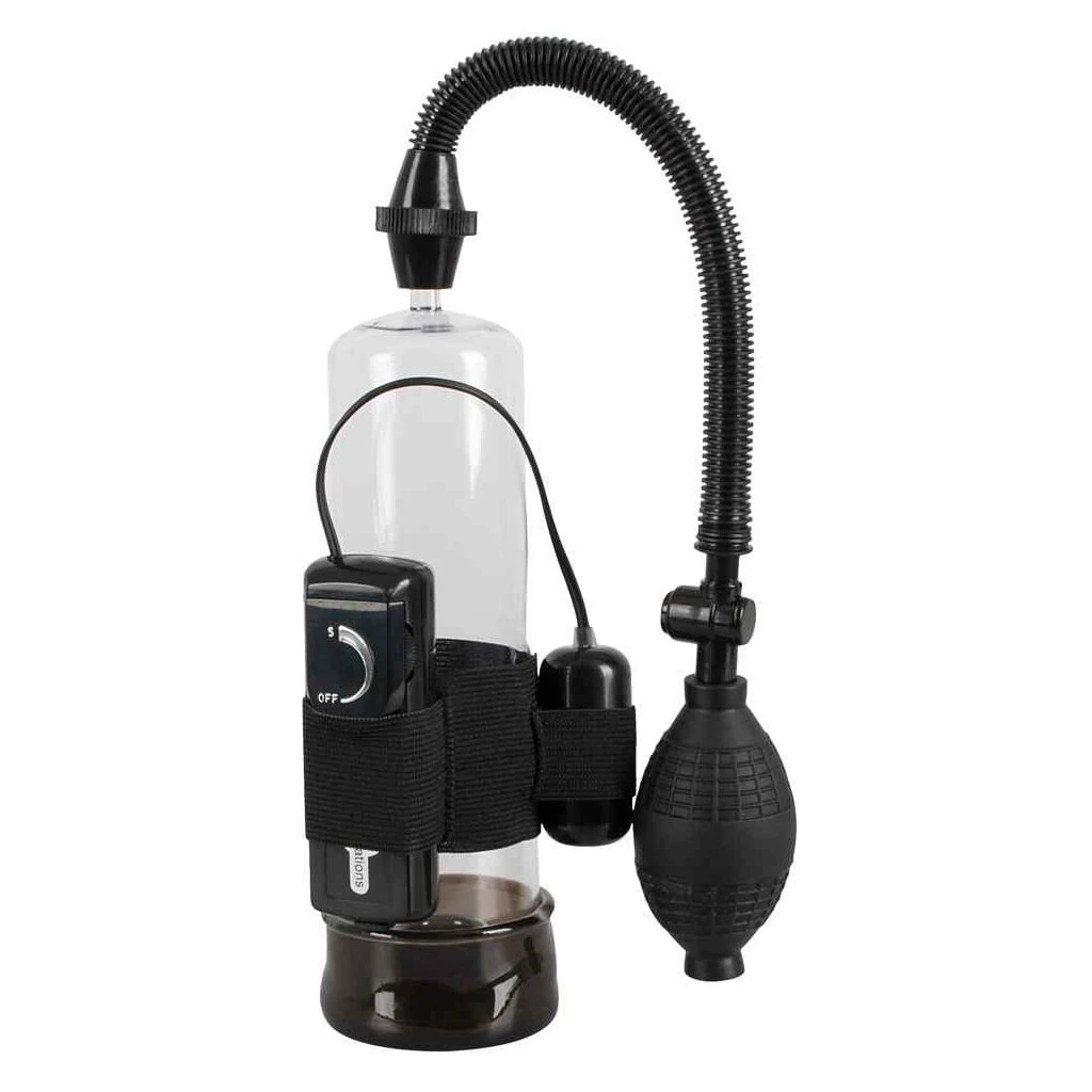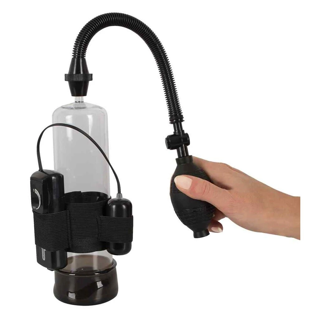 Penispumpe aus festem Gleitmaterial mit kraftvoller Vibration für steile Erektionen und mehr. Führen Sie Ihr Glied durch die enge Manschette (TPE) in den Klarsicht-Zylinder ein und erzeugen Sie mit der Pumpe ein erregendes Potenz-Vakuum.
