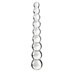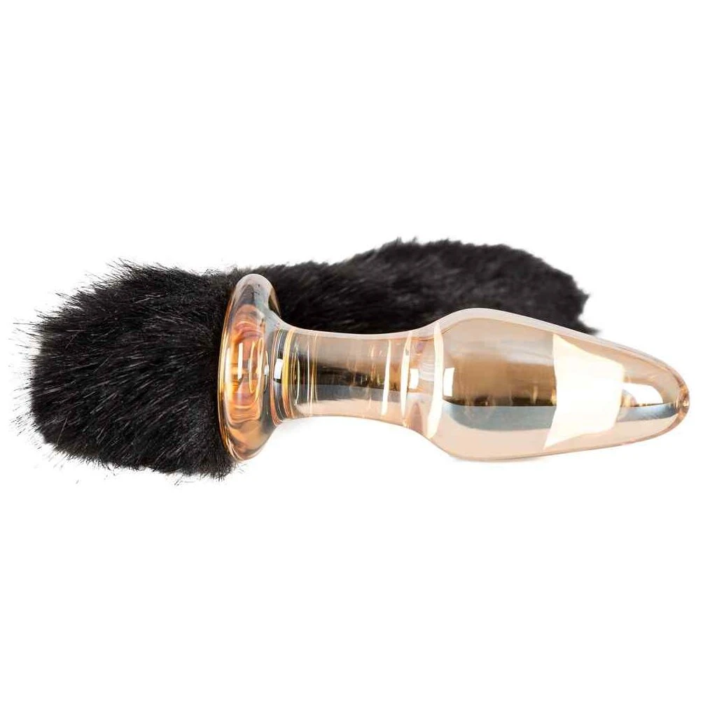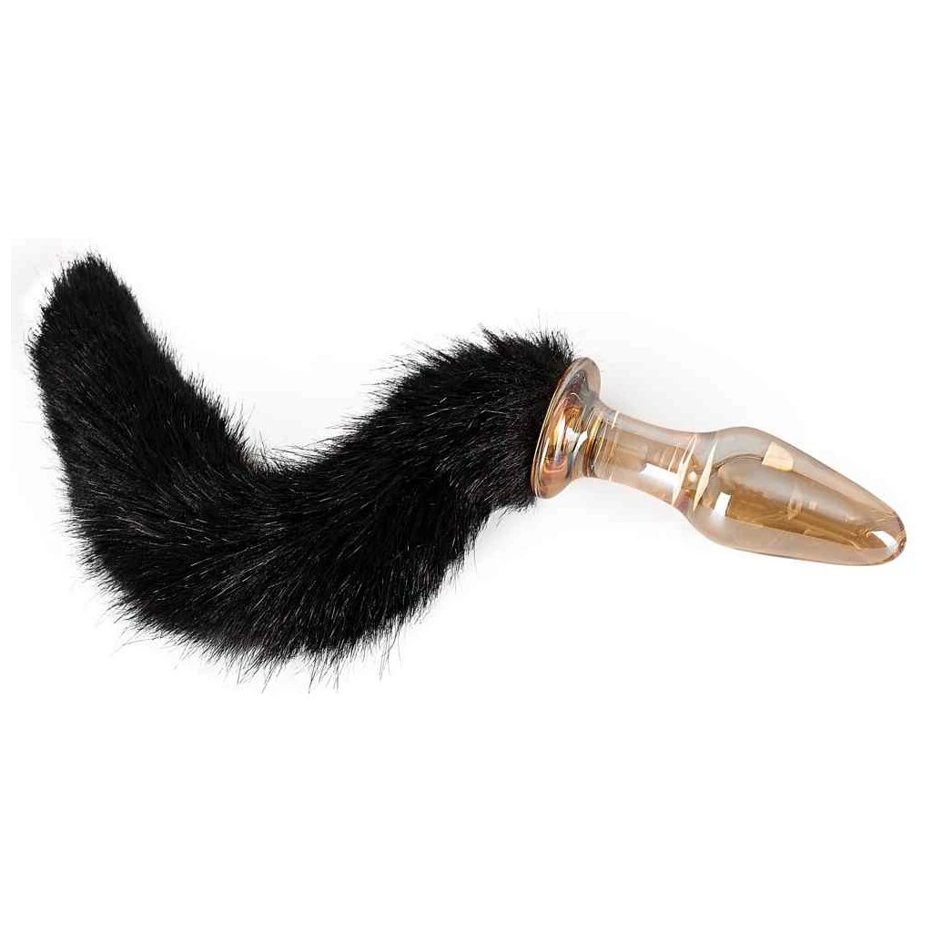 Gold-transparenter, bruchsicherer Glas-Analplug mit kleinem Sockel am Ende, an dem ein schwarzer Kunstfell-Schwanz befestigt ist. Gesamtlänge ca. 12 cm. Einführtiefe: 10,5 cm, Durchmesser: 2,1-3,8 cm. Kunstfell-Schwanz: ca. 28 cm lang. Material: Glas, Acryl.