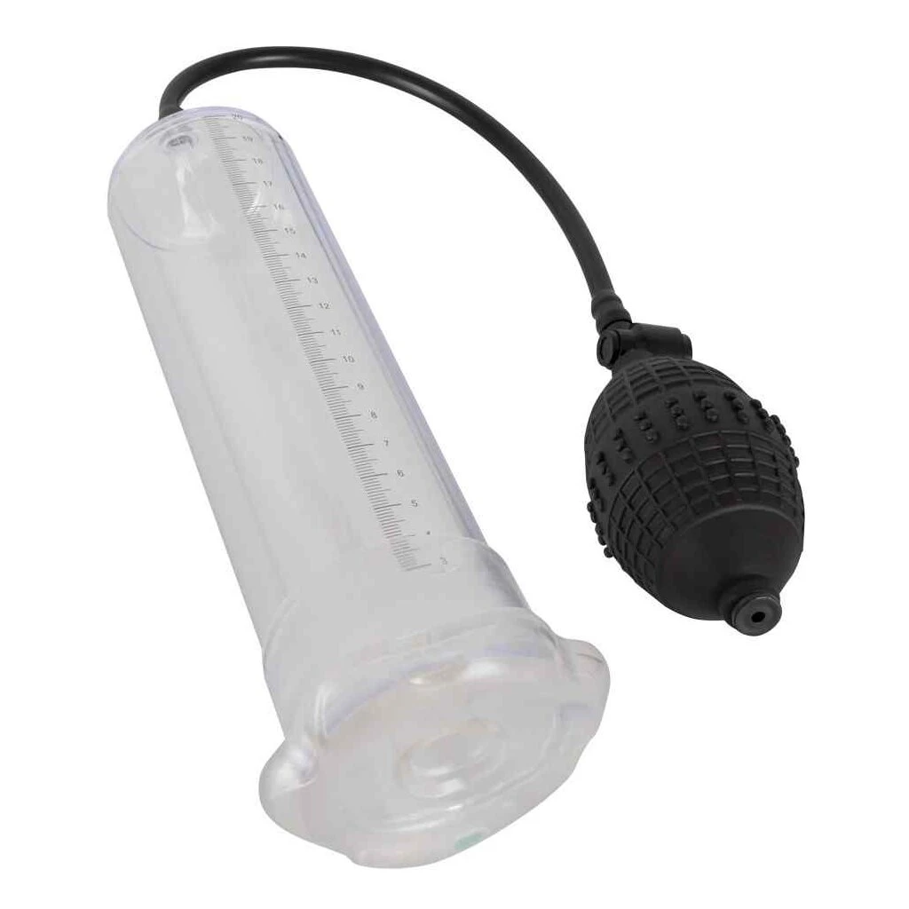 Transparente Penispumpe mit anliegender Manschette (Ø 2 cm dehnbar) und handlichem Pumpball. An der Messskala wird der Vergrößerungserfolg abgelesen. Mit Sicherheitsdruckventil. Zylinder ca. 22 cm lang, Ø 5.6 cm. ABS, TPE (Manschette), PVC (Pumpball).